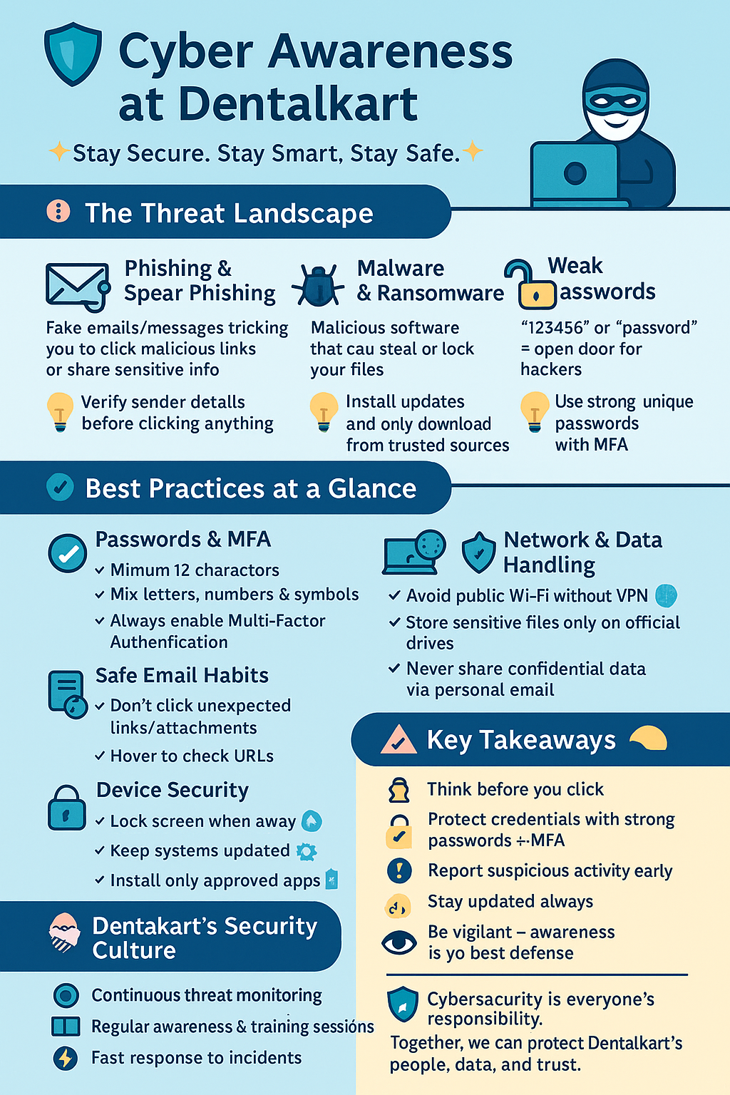 Cybersecurity is not just about firewalls and antivirus software—it’s about awareness and habits. At Dentalkart, every employee plays a critical role in keeping our systems, data, and patients’ trust safe from cyber threats. This guide will help you understand risks, best practices, and how to stay one step ahead.